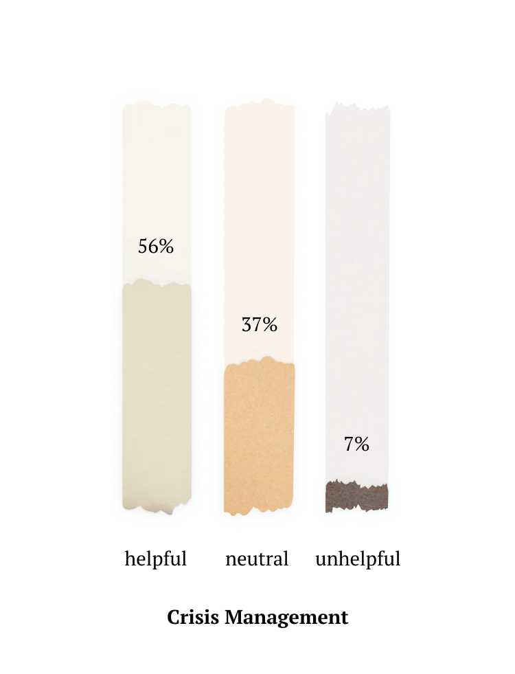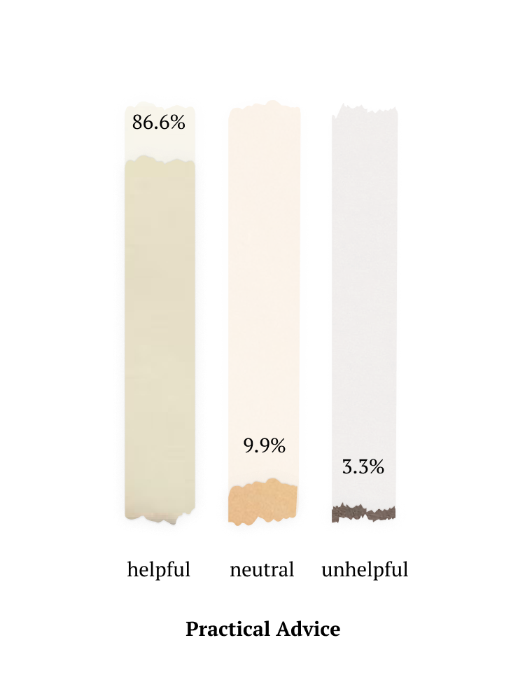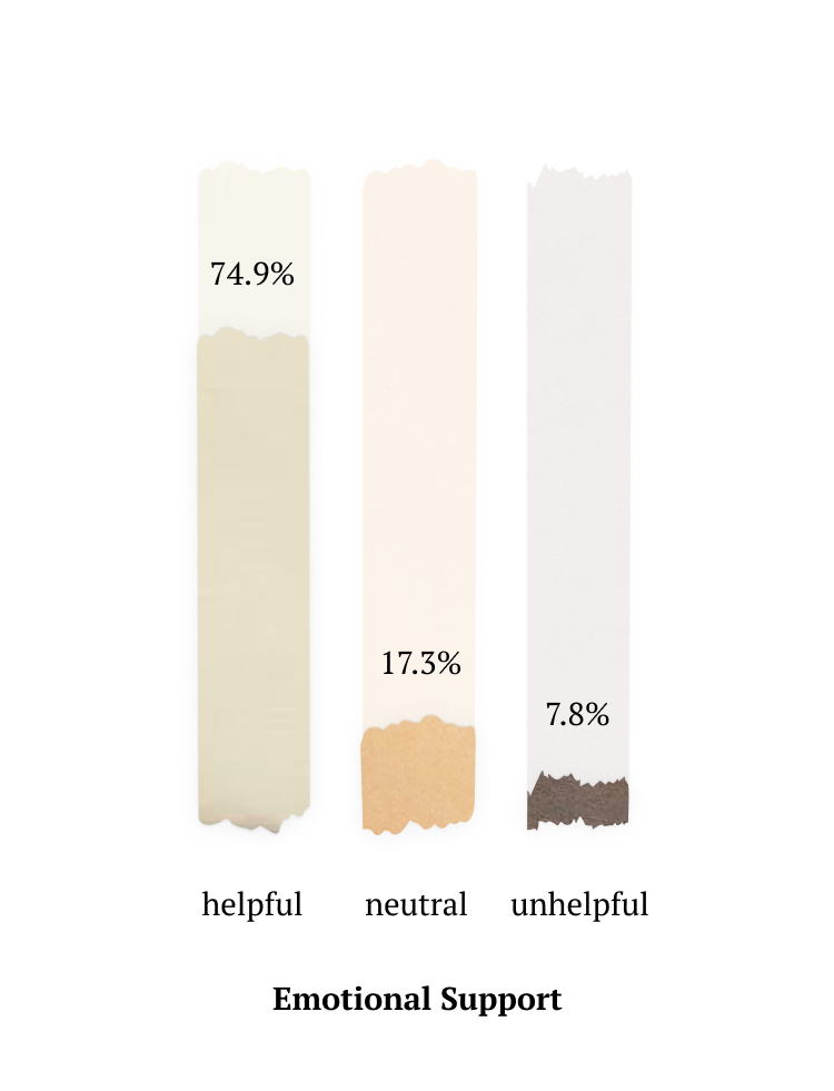 The perceived benefit was further reflected in participants’ ratings of specific aspects of LLM helpfulness, with particularly strong positive evaluations for emotional support (74.9% rating as helpful or very helpful), practical advice (86.8% rating as helpful or very helpful) and crisis management (56% rating as helpful or very helpful). For example, one participant reported,