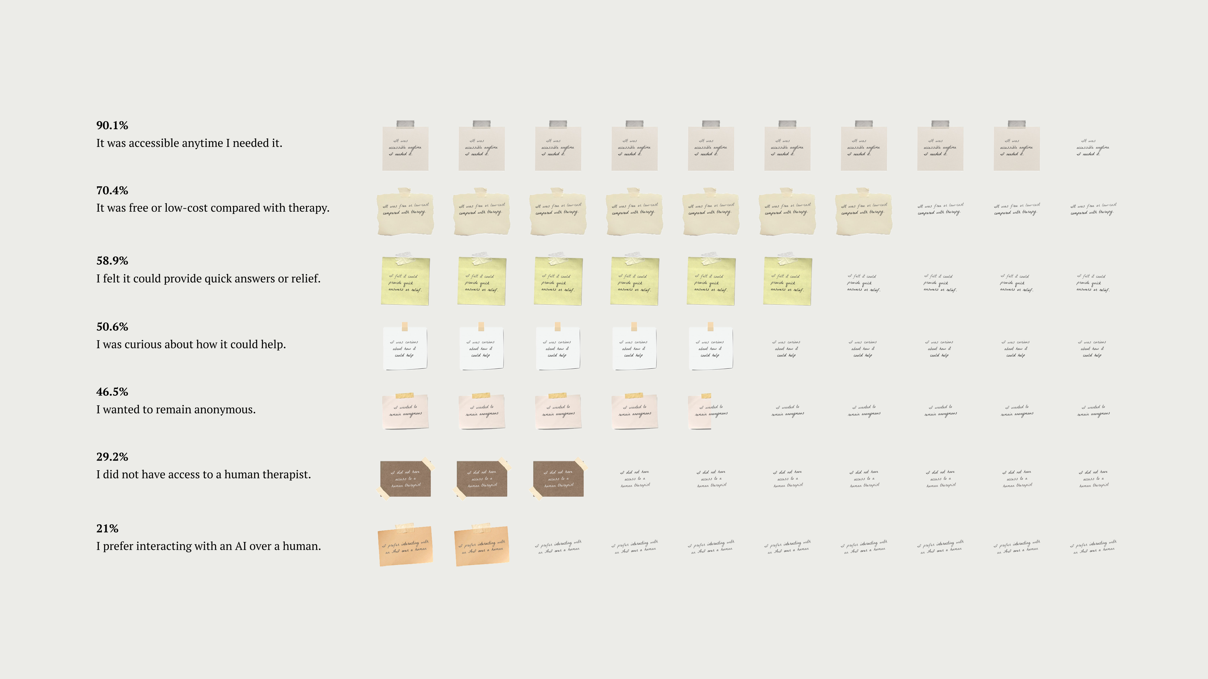 Among 243 respondents who has used LLM for mental health support or therapy-related goals in the past year, the top motivations were strikingly simple.